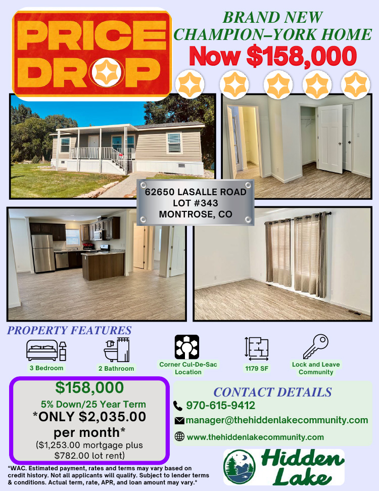Lot #343 in Hidden Lake is a brand-new home offering 3 bedrooms, 2 bathrooms, and 1179 square feet of bright, modern living. This home is ideal for buyers seeking a low-maintenance, lock-and-leave lifestyle in one of Montrose’s most amenity-rich communities. With thoughtful design and community perks, it’s a perfect blend of comfort and convenience.
